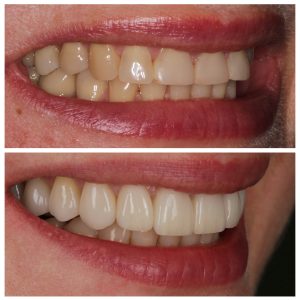 Dėl natūralių amžinių pokyčių, sąkandžio sužemėjimo ir senų plombų išryškėjo pakitusi dantų estetika. Ją koregavome protezavimu, kurį sudarė dantu laminatės ir dantų karūnėlės.